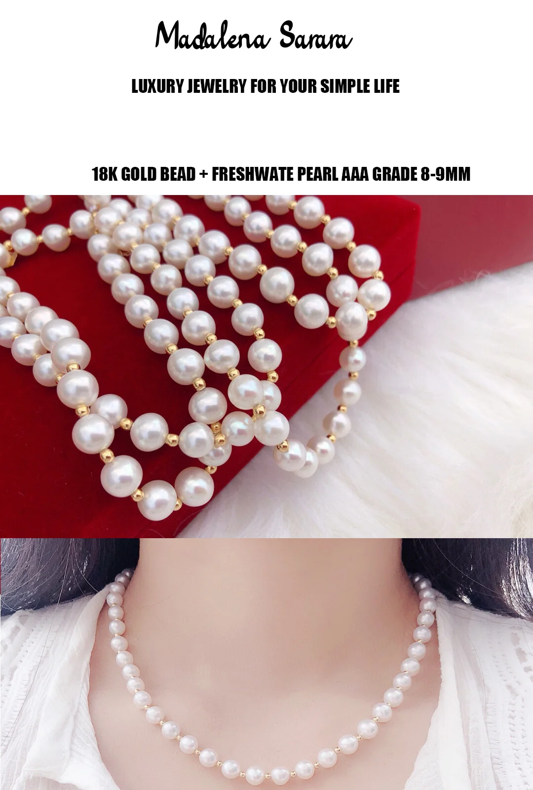 Product Name: Madalena Sarara Aaa 8-9ミリメートル淡水真珠のネックレスの女性パールジュエリーナチュラルホワイトラウンド形状S925 Clasp18kゴールドクラスプ